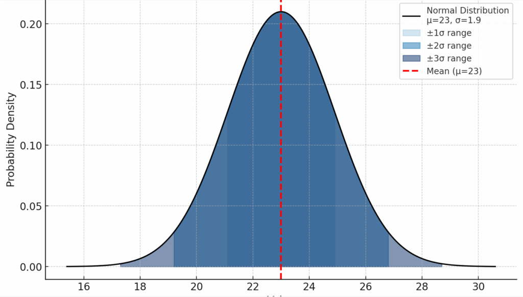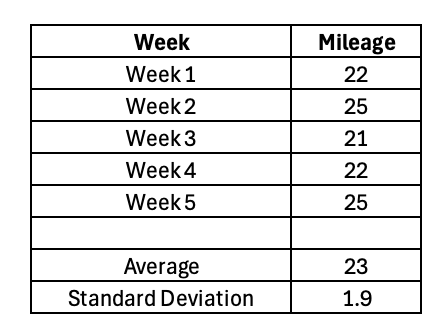 Basic statistics tell us Joe ran an average 23 miles per week, with a standard deviation of 1.9 miles. And if we plot this data on a normal distribution, we can predict with a high degree of confidence how many miles Joe will run next week.